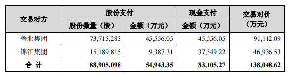 在交易支付方面,魯北化工擬向魯北集團支付50%股份和50%現金,擬向錦江集團支付20%股份和80%現金。