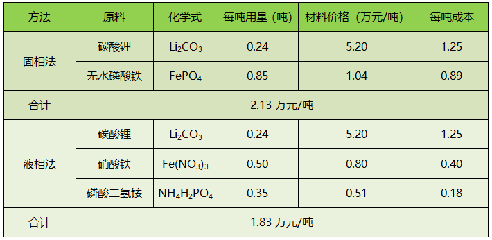 由上表我們可以清晰地看出,固相法的原料成本更高一些,主要是因為無水磷酸鐵的價格高,導致固相法原材料價格偏高。