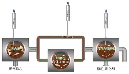 SOPAT研發并優化了一套可用于測量可可漿中固體顆粒的儀器: Choco-Scope。使用此儀器可以直接在線測量如可可,糖,奶粉,堅果和華夫餅等顆粒的大小和形狀,無需取樣或稀釋。與之匹配的軟件既可以進行圖片自動分析,也可以提供數量和體積加權平均粒度分布,如Xv50或Xv90。