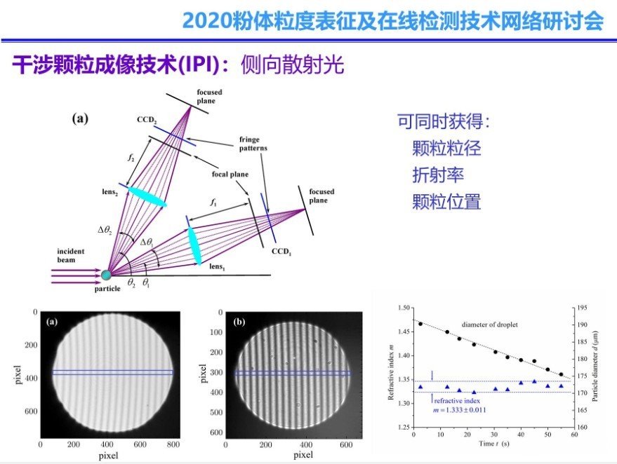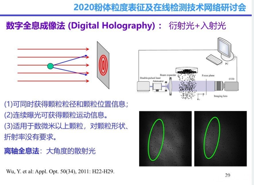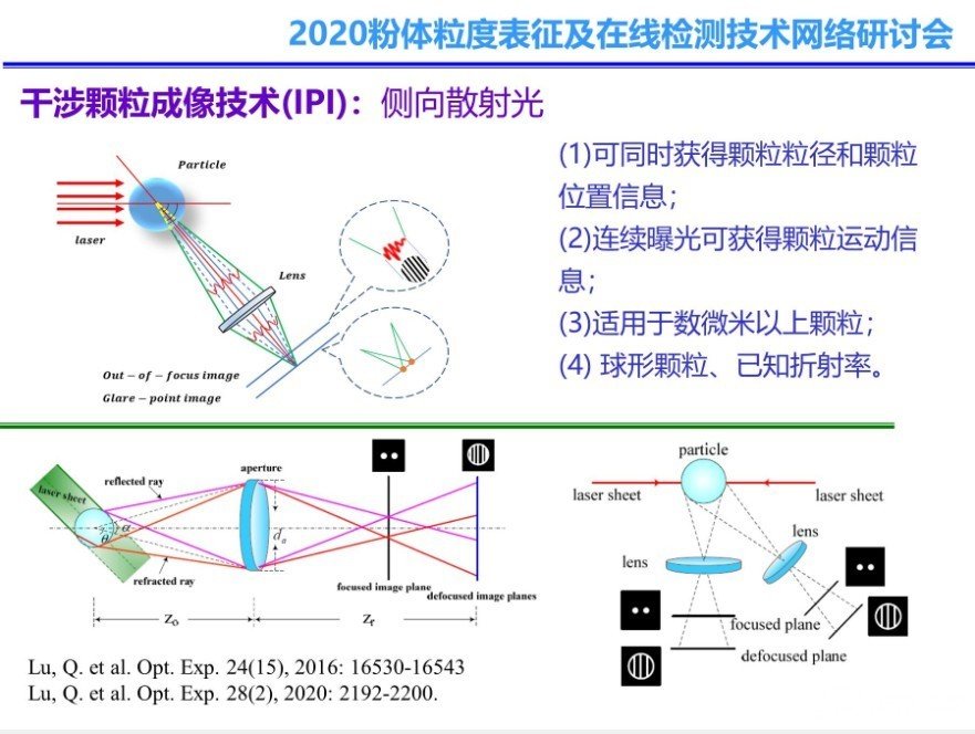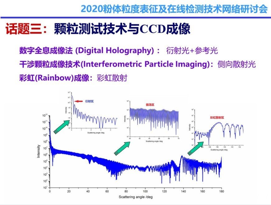 隨著工業(yè)對顆粒檢測效果的要求不斷提高,顆粒檢測技術(shù)也在不斷推陳出新,其中顆粒測試技術(shù)與CCD成像結(jié)合是未來顆粒檢測技術(shù)發(fā)展的大趨勢,在報告中,沈教授結(jié)合研究前沿和工程實踐,生動形象的介紹了當(dāng)前流行的顆粒檢測與CCD成像技術(shù)應(yīng)用范例:數(shù)字全息成像法、干涉顆粒成像技術(shù)、彩虹成像。其中數(shù)字全息成像法利用“衍射光+參考光”成像,干涉顆粒成像技術(shù)則利用側(cè)向散射光成像,而彩虹成像所利用的則是彩虹散射成像。