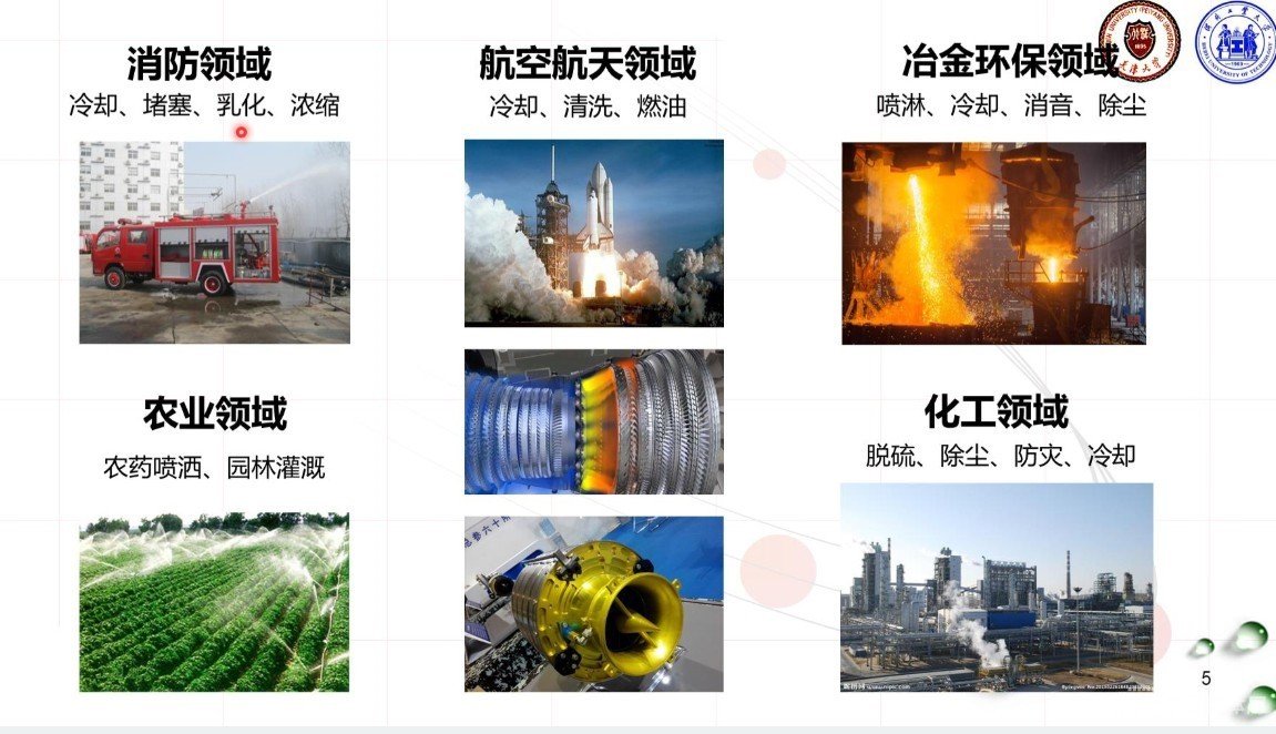液滴顆粒是組成霧場的基本粒子,在自然界中廣泛存在,在實際生產(chǎn)應(yīng)用中也可以通過技術(shù)手段人工制造霧場。人工霧場主要由噴嘴噴射形成,其主要特性包括噴射角度、壓力、高溫環(huán)境下應(yīng)用溫度特性。其主要應(yīng)用領(lǐng)域涵蓋水利工程、化工領(lǐng)域、消防領(lǐng)域、農(nóng)業(yè)生產(chǎn)領(lǐng)域和環(huán)境保護(hù)領(lǐng)域。