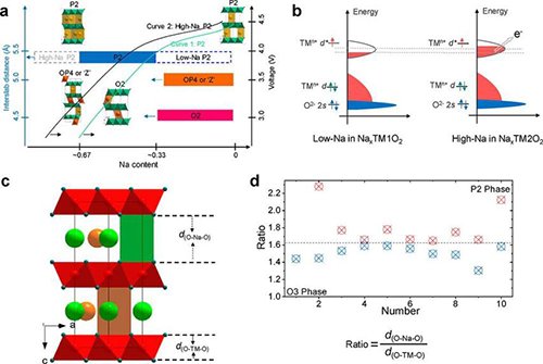 圖1.(a) 高鈉含量P2氧化物在脫鈉過程中的結構演變機理;(b) 低/高鈉含量P2氧化物的電子結構;(c) P2氧化物晶體結構;(d) dO-Na-O和dO-TM-O在P2和O3型化合物中的比值