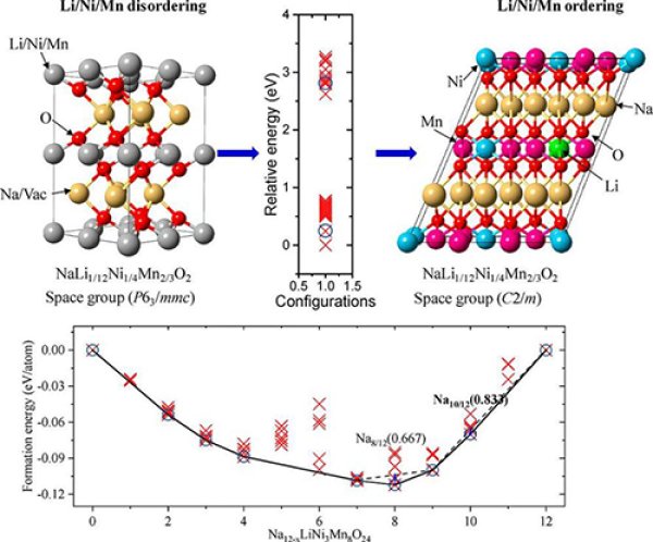 圖3.(a) Na12-xLiNi3Mn8O24中Li/Ni/Mn的排列;(b) Na12-xLiNi3Mn8O24-LiNi3Mn8O24中的相穩定性