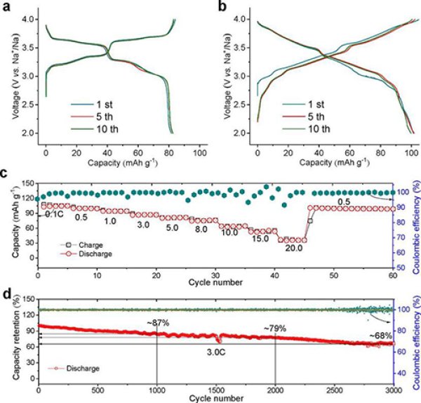 (c) Na45/54Li4/54Ni16/54Mn34/54O2的倍率性能;