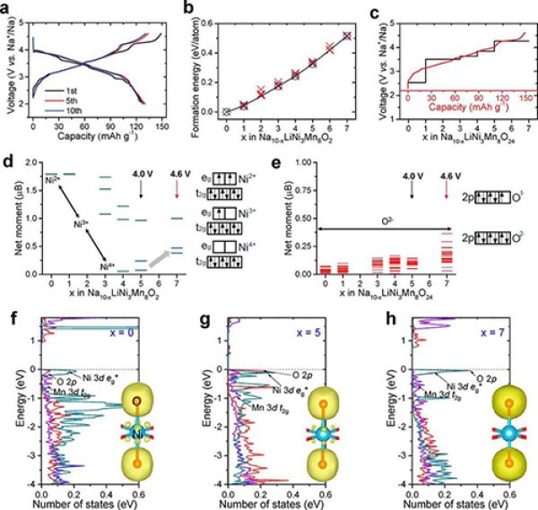 (d-e) Na10LiNi3Mn8O24到Na3LiNi3Mn8O24脫鈉過程中間相的Ni和O的磁化和氧化態;