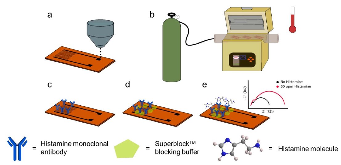 在該項目中,石墨烯電極以氣溶膠方式印刷在柔性聚合物上,通過將組胺抗體與石墨烯化學結合而轉變為組胺傳感器,抗體特異性結合組胺分子,組胺會阻止電子轉移并增加電阻,而電阻變化可由傳感器測量和記錄。該工藝制備的石墨烯電化學傳感器能檢測的組胺范圍為6.25-200ppm,檢測限低至3.41 ppm。(檢測物為金槍魚肉湯)