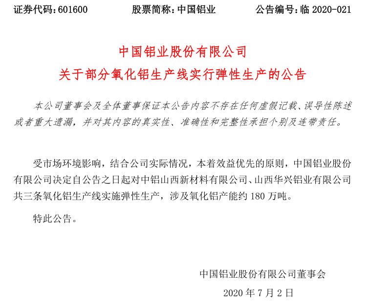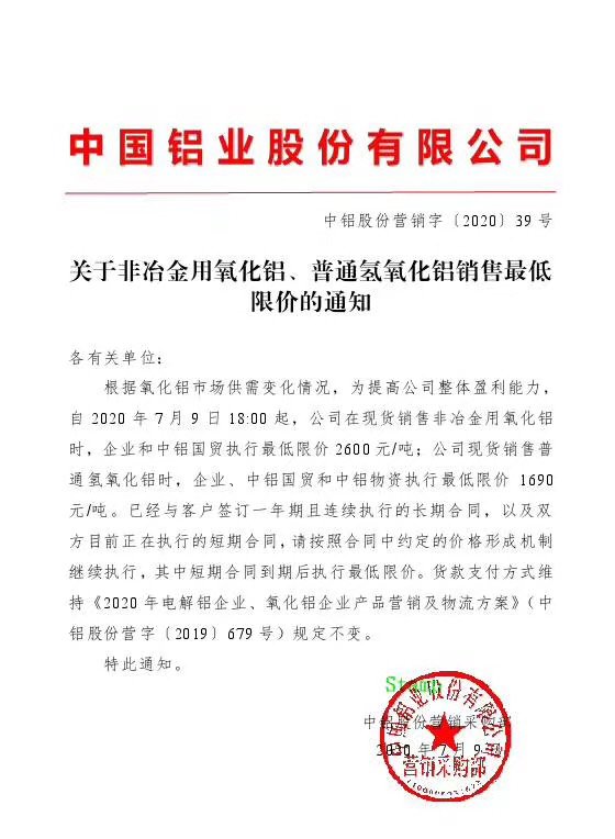 中國粉體網訊 繼7月2日發布公告稱對中鋁山西新材料有限公司、山西華興鋁業有限公司涉及產能約180萬噸、共三條氧化鋁生產線實施彈性生產之后,中鋁近日又發布通知稱,根據氧化鋁市場供需變化情況,為提高公司整體盈利能力,自2020年7月9日18:00起,公司在現貨銷售非冶金用氧化鋁時,企業和中鋁國貿執行最低限價2600元/噸,;公司現貨銷售普通氫氧化鋁時,企業、中鋁國貿和中鋁物資執行最低限價1690元/噸。