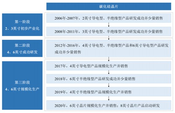 天科合達自2006年成立以來,一直專注于碳化硅晶體生長和晶片生產領域,先后研制出2英寸、3英寸、4英寸碳化硅襯底,于2014年在國內首次研制出6英寸碳化硅晶片,并已形成規模化生產能力,工藝技術水平處于國內領先地位。