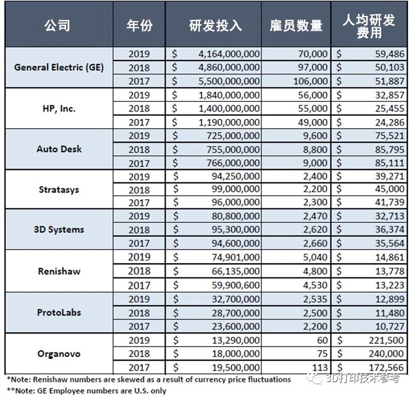 2、“純”3D打印機制造商屬于工程/設計密集型企業,他們人均每年的研發支出達到79500美元,不過這并不包括GE和HP。