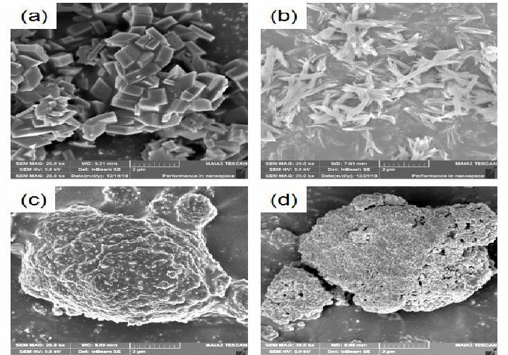 不同原料的SEM圖:(a)γ-AlOOH(氫氧化鋁制);(b)γ-AlOOH(九水硝酸鋁制);(c)(α+θ)-Al2O3;(d)α-Al2O3