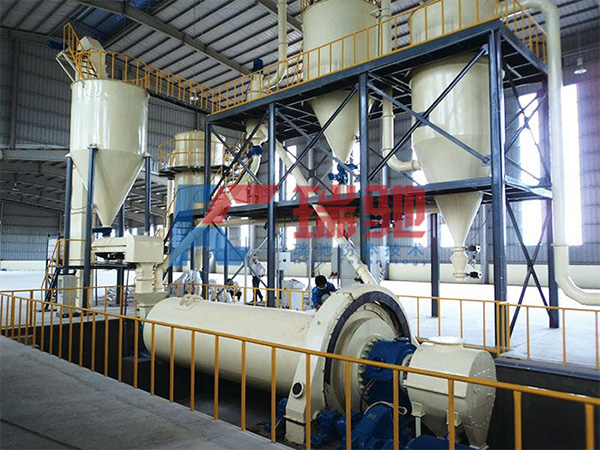 粉碎后,材料由提升機輸送到筒倉,再由可控進料裝置加入球磨。磨機中的研磨介質通過磨機轉動時獲得的動能反復撞擊和研磨材料。粉碎后的材料通過球磨機的尾部排放到吸槽中,并通過負壓輸送到分類器內部。合格的細粉由旋風收集器或除塵器收集。將分類后的粗粒從分類器的下端排出,然后通過輸送管重新進入球磨進行研磨。凈化后的氣體通過感應氣流排出。