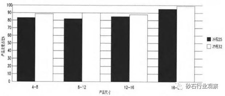 由圖3可得閉合式生產(chǎn)線所生產(chǎn)的產(chǎn)品粒度占比遠(yuǎn)遠(yuǎn)高于開放式生產(chǎn)線。原因是不合格的返料多次破碎,成品形狀更好,特別是細(xì)料產(chǎn)品更突出。