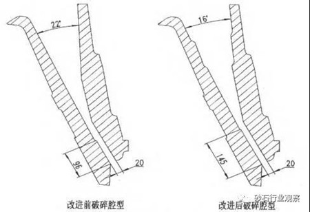 改進(jìn)后破碎腔嚙角由22°變?yōu)?6°,嚙角的減小可以夾住較大石料,防止破碎時(shí)石料往上跳,這樣破碎腔中石料填充率提高,形成層壓破碎,減少產(chǎn)品石料針片狀含量,優(yōu)化產(chǎn)品粒度。