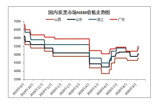 從圖中明顯能夠看出,從今年的3月底4月初開始,炭黑(山東、山西、河北)市場的價格開始呈現階梯式下降模式,直到6月份開始,開始呈現階梯式增長趨勢,并且趨勢一直只增不減,并超過今年剛開始的炭黑價格,累計上漲1300元/噸。