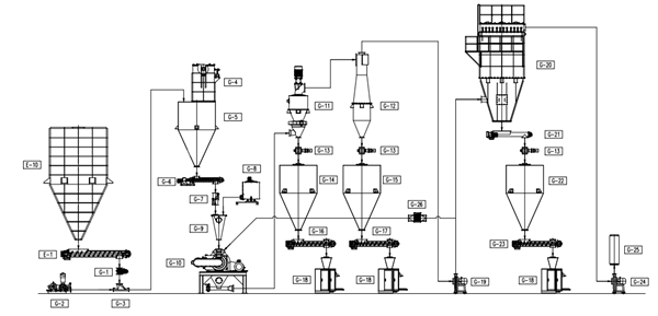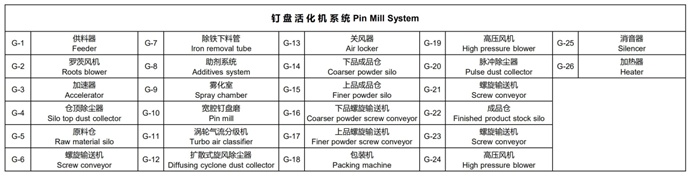 其工作原理是:將經過溫控加藥系統精確計量過的表面改性劑通過特制的霧化噴嘴被送至霧化室,讓表面改性劑與干燥的粉體物料在霧化室進行混合。若使用固體狀改性劑,改性劑會先在溫控加藥系統內被加熱融化至液態。表面改性劑與被改性的粉體物料先進入霧化室進行混合,接著自動連續地進入釘盤內,受到盤內不同方向的氣流沖擊,高速旋轉的轉子讓特殊設計的釘盤內形成渦旋二相流,讓物料和改性劑被充分打散。依靠轉子高速旋轉與粉體物料的沖擊、剪切和摩擦作用所產生的熱量,粉體和改性劑在盤內迅速升溫,達到改性需要的溫度,也因此讓兩者得以充分接觸、混合,改性劑能迅速、均勻地與粉體顆粒表面作用,包覆于顆粒表面,完成對粉體的表面包覆改性。接著然后改性后的粉體成品進入后端的氣流分級機系統進行分選,合格的細粉將會被選到旁邊的旋風集粉器進行冷卻和收集。