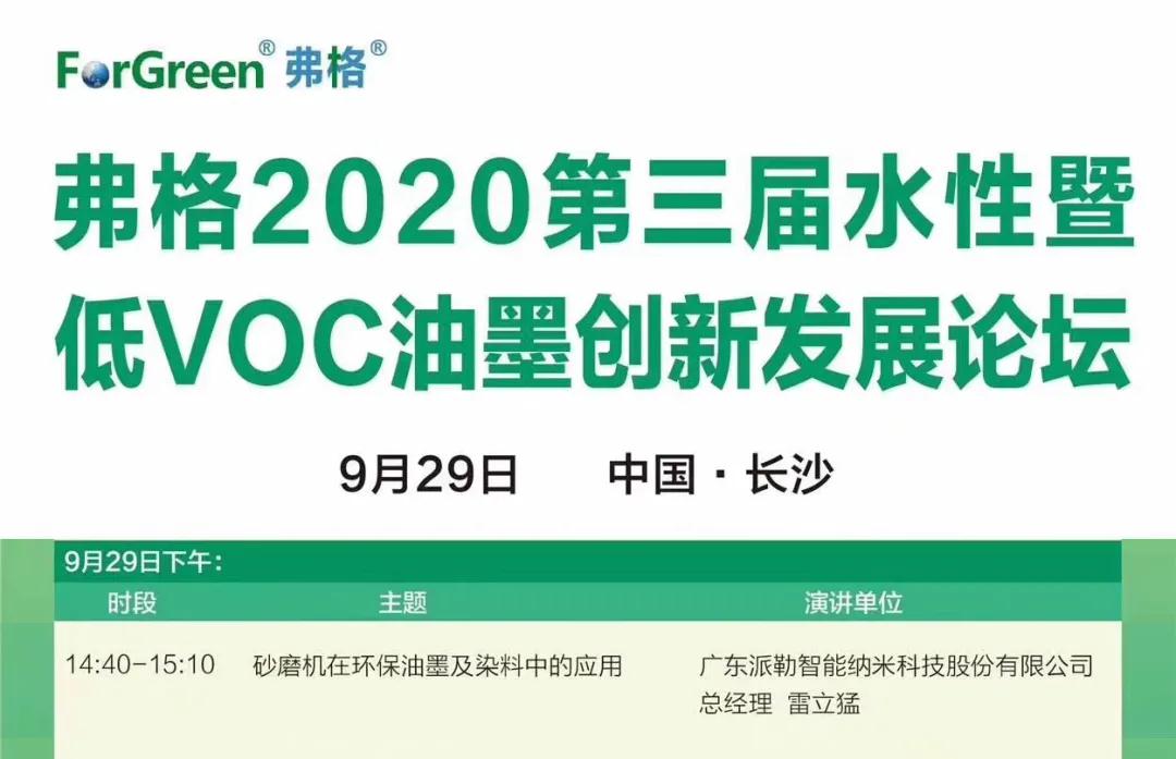 2020年9月27-29日,2020第三屆水性暨低VOC油墨創新發展論壇將在湖南●長沙華雅國家大酒店舉行。論壇圍繞著創新研發成果展開深入的探討,廣東派勒智能納米科技股份有限公司作為涂料制備企業中的代表,在這次論壇會場開設展臺與各位新老朋友見面,派勒智能總經理雷立猛先生將作“砂磨機在環保油墨及染料中的應用”的主旨報告。