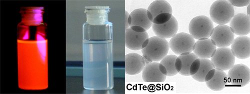 圖為復合微粒水溶液的熒光照片;中圖為該溶液的室光照片;右圖為復合熒光微粒的透射電鏡照片,在每個微球的中心部位都含有一個CdTe量子點。