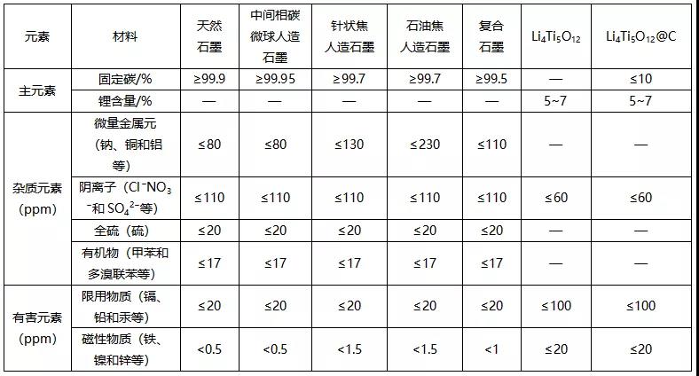 石墨主要由固定碳、灰分和揮發分三部分組成,固定碳是真正起電化學活性的組分,標準中對固定碳的含量有著嚴格要求,至少大于99.5%。此外,除了固定碳、鋰主要元素,負極材料在進行包覆、摻雜等改性過程中會引入一些雜質元素,它們也會嚴重影響電池的電化學性能,需要嚴格控制。另外,部分負極原料中含有鎘、鉛、汞、六價鉻及其化合物等限用元素,它們對動物、植物和環境有害,因此在標準中對此類物質有嚴格的限制。