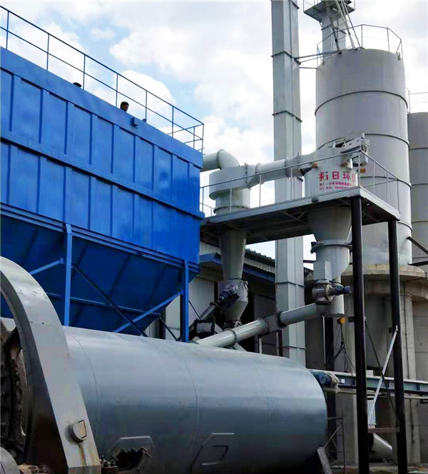 物料經過破碎機粗破后,由提升機輸送到球磨機,經過球磨機內的研磨作用下,介質在磨機筒體內旋轉時所獲得的重力對物料進行沖擊粉碎和研磨粉碎,剪切粉碎后的物料進入緩沖卸料倉,進入干粉式氣流粉分級機進行分級,實現物料粗細篩選,合格的物料由旋風收集器、除塵收集器收集,粗料由干粉分級機排出,返回球磨機進行研磨,污染少氣體由高壓引風機排出。
