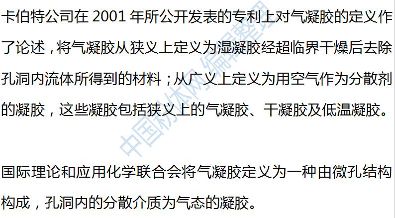 據中國粉體網編輯的學習了解,世界上的第一塊氣凝膠由Kistler在1931年制得,Kistler將氣凝膠定義為濕凝膠內的液體被氣體取代,同時在該過程中凝膠骨架為基本不發生變化的多孔材料。在后續的發展中,人們對于氣凝膠有了更深刻、更多樣化的認識,但目前對于氣凝膠的定義尚未有統一的標準。