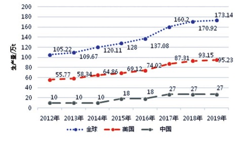 據(jù)聯(lián)合國統(tǒng)計司數(shù)據(jù),2012 年以來 SiO2 含量≥ 99.9% 高純石英砂生產(chǎn)整體呈上升趨勢。2012 年生產(chǎn)量 74.85 萬 t,2019 年增長到 123.62 萬 t,增長幅度 65.16%。中國生產(chǎn)量由 6.72 萬 t,增長到23.7 萬 t,增長率 251.11%。