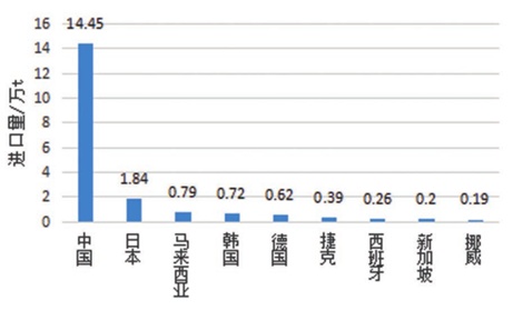 2019 年全球高純石英進口量 20.54 萬 t,其中中國進口量為 14.45 萬 t,是全球第一大高純石英進口國,占全球進口總量的 70.35%。其次是日本、馬來西亞、韓國等。