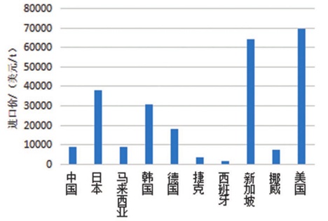 高純石英產(chǎn)品出口單價相差懸殊,其中美國、日本、韓國、德國等國主要出口高純石英深加工產(chǎn)品,出口單價較高。日本 29 114.95 美元 /t、美國 21 163.88 美元 /t、德國 13 159.38 美元 /t、韓國9 093.04 美元 /t。