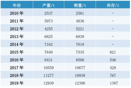 2010-2019江蘇太平洋石英股份有限公司高純石英砂產(chǎn)銷存數(shù)據(jù)