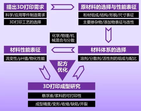 針對不同3D打印工藝和應用場景需求,開發各種性能穩定且打印質量可靠的材料。研究所目前主要集中在有機物高分子、各類復合陶瓷懸浮液/漿料材料等方面的研究。總體材料開發和配制路線方案為: