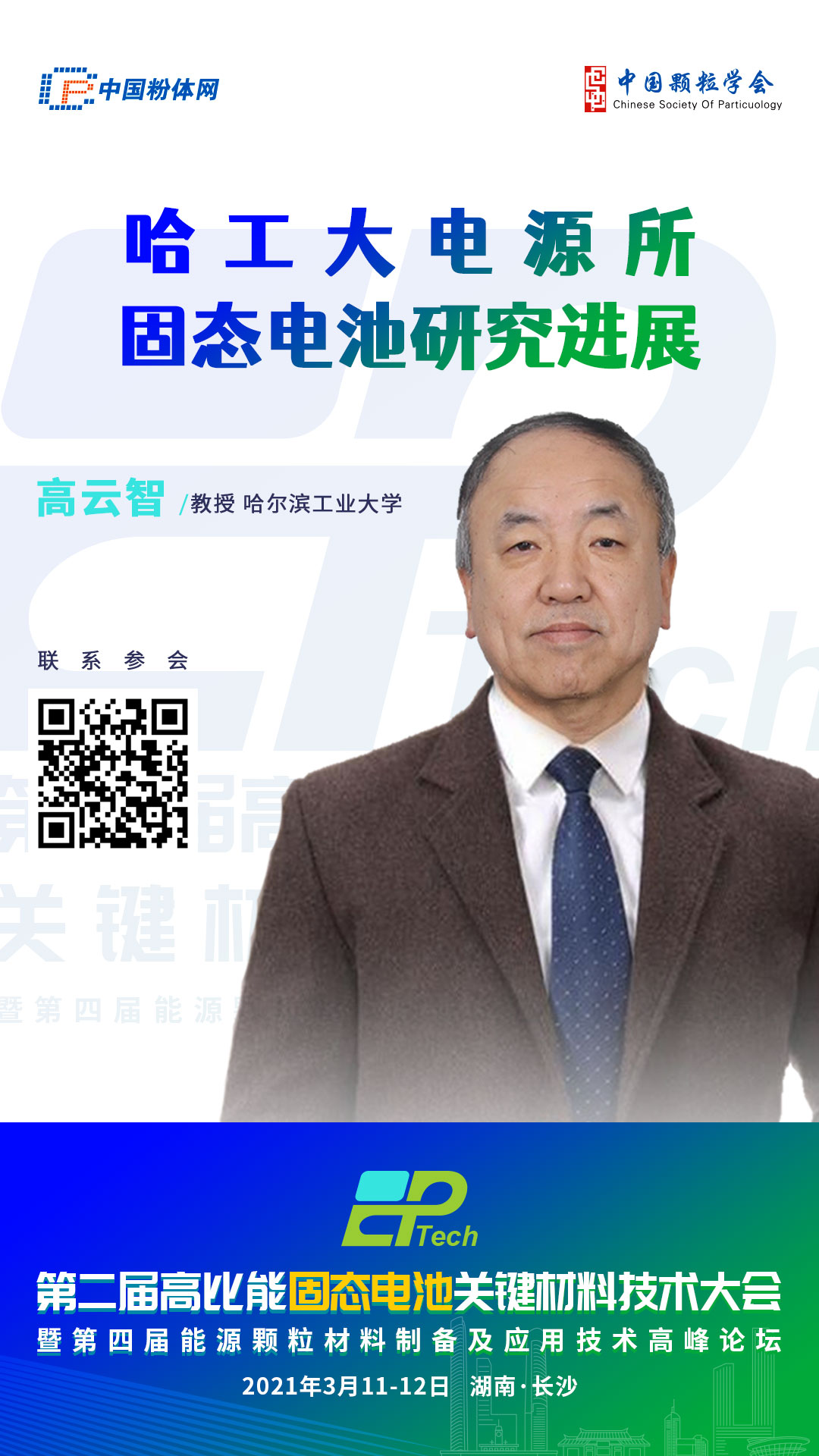 2021年3月11-12日,由中國粉體網、中國顆粒學會能源顆粒材料專委會主辦,長沙礦冶研究院先進材料研究所協辦的第二屆高比能固態電池關鍵材料技術大會將在長沙吉美國際會展酒店隆重舉行,屆時,高云智教授將帶來報告《哈工大電源所固態電池研究進展》,與參會嘉賓分享相關研究成果。