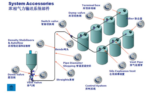 濃相氣力輸送系統(tǒng)可將物料從一個(gè)或多個(gè)集料點(diǎn)輸送到一個(gè)或多個(gè)接收點(diǎn),可輸送各種類(lèi)型的粉體物料,如粉末,顆粒,混合料等各種松散的固體物料。
