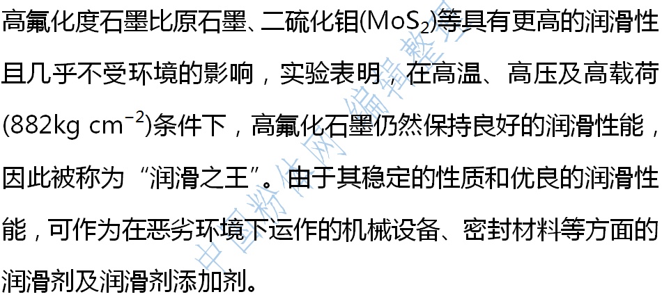 除此以外,基于氟化石墨的特殊性能,還可將氟化石墨涂覆于物質表面制成吸音材料;作為核反應堆的減速劑、涂敷材料和反射材料等,阻礙相應物質的吸附;用于內燃機及其產生的廢氣排放管處,以降低噪音等。