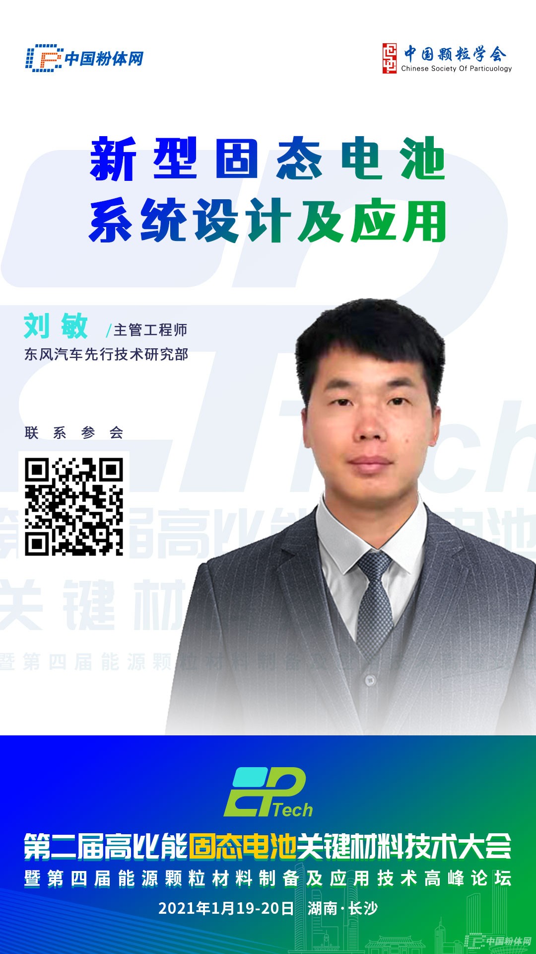 2021年3月11-12日,由中國粉體網、中國顆粒學會能源顆粒材料專委會主辦,長沙礦冶研究院先進材料研究所協辦的第二屆高比能固態電池關鍵材料技術大會將在長沙吉美國際會展酒店隆重舉行,屆時,東風汽車技術中心前瞻技術研究院高級工程師劉敏博士將帶來報告《新型固態電池系統設計與應用》,與參會嘉賓分享相關研究成果。