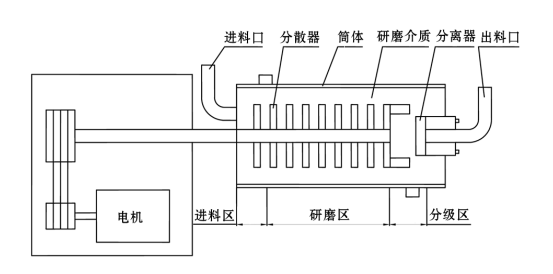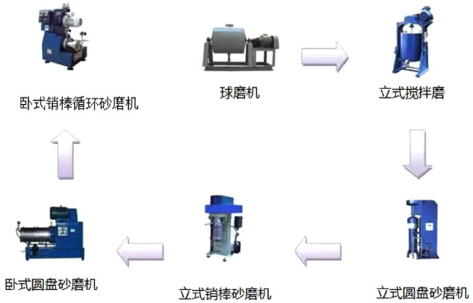 通過實踐和經驗表明,通常需要經過2~3 次研磨,物料平均粒徑可以達到2~3μm。具體操作方法是采用多臺砂磨機串聯使用,每臺砂磨機筒體中使用的研磨介質粒徑可以是相同的或者不同的;倘若是不同的,通常排列順序是研磨介質粒徑是由粗到細。