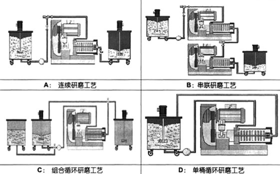 砂磨機的研磨工藝流程主要有四種,分別是連續研磨工藝,串聯研磨工藝、組合循環研磨工藝和單桶循環研磨工藝。單桶循環研磨工藝前提是循環次數大于5,循環桶上配有攪拌器,以保證物料充分混合,避免循環桶中的死角。該工藝操作簡單,設備投資小,一般用于陶瓷原料,如碳化硅、氮化硅、碳化硼等的研磨。