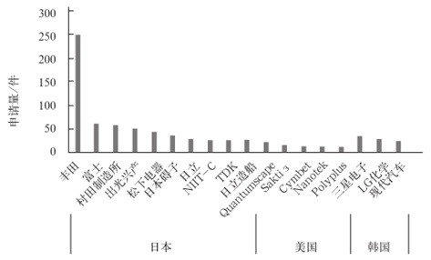 在專利主體方面,作為全球第一大車企的豐田公司目前擁有固態電池專利252件,數量遠超其他車企與電池企業,同時日本其他消費電子及汽車零部件企業如富士、村田制造所、松下也在固態電池領域廣泛布局?傮w來看,日本固態電池的研發以產業界為主導。美國固態電池專利分布比較分散,而且其持有的主體多為Quantumscape(21件)、Sakti3(17件)等初創企業。韓國專利分布相對集中,如三星電子(35件)、LG化學(29件)、現代汽車(25件),與日本相似,韓國在固態電池領域的研發也是以產業界為主導,且電池企業與整車企業均有布局。