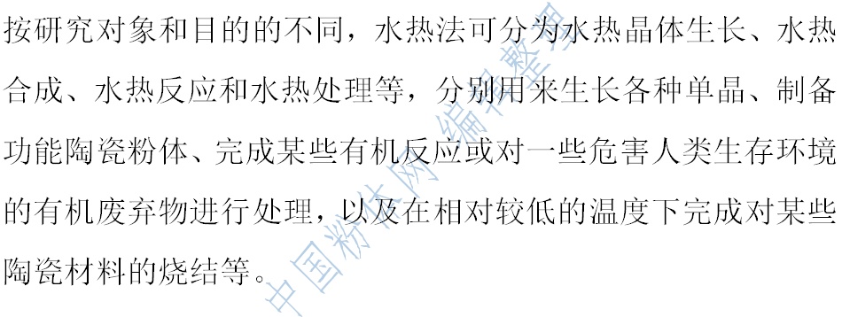 按反應(yīng)溫度進(jìn)行分類,則可分為低溫水熱法和超臨界水熱合成。低溫水熱法所用溫度范圍一般在100~250℃之間。超臨界水熱合成是指利用作為反應(yīng)介質(zhì)的水在超臨界狀態(tài)(即在水的臨界溫度374℃,臨界壓力22.1MPa以上條件時(shí))下的性質(zhì)和反應(yīng)物在高溫高壓水熱條件下的特殊性質(zhì)進(jìn)行合成反應(yīng)。