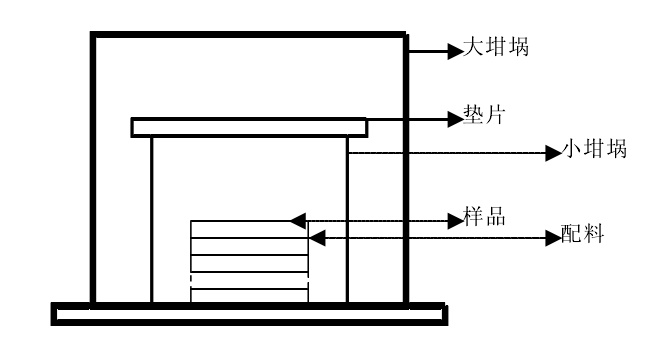 實驗二:采用無壓空氣燒結的方式進行粉體的燒結。樣品平放在平板上的小坩堝里,樣品之間用配料隔開。用含有PbO的填料將樣品完全覆蓋,蓋好,坩堝與平板之間用ZrO2密封,外面罩上大坩堝,然后將樣品放入箱式爐中按設定的溫度進行燒結。裝配示意圖如圖。