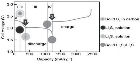 據(jù)硫的質(zhì)量計(jì)算,鋰硫電池理論比容量為1675mAh/g,電池平均放電電壓為2.2V,鋰硫電池的理論能量密度能達(dá)2600Wh/kg,遠(yuǎn)遠(yuǎn)高于傳統(tǒng)鋰離子電池的能量密度。另外,硫磺資源豐富、低廉易得、基本無(wú)毒性,與鋰的電化學(xué)反應(yīng)有望是充放電過(guò)程可控的可逆反應(yīng),所以高能量密度的鋰硫電池備受期待。從發(fā)展進(jìn)程來(lái)看,鋰硫電池的概念早在十九世紀(jì)六十年代就被提出,但是因受到循環(huán)性能差等限制而未受到足夠重視。直到在2009年,加拿大科學(xué)家Nazar等報(bào)道使用CMK-3介孔炭作為硫的載體,利用介孔束縛多 硫化物產(chǎn)物,使電池性能顯著提高,從而顯著提速了鋰硫電池的發(fā)展。