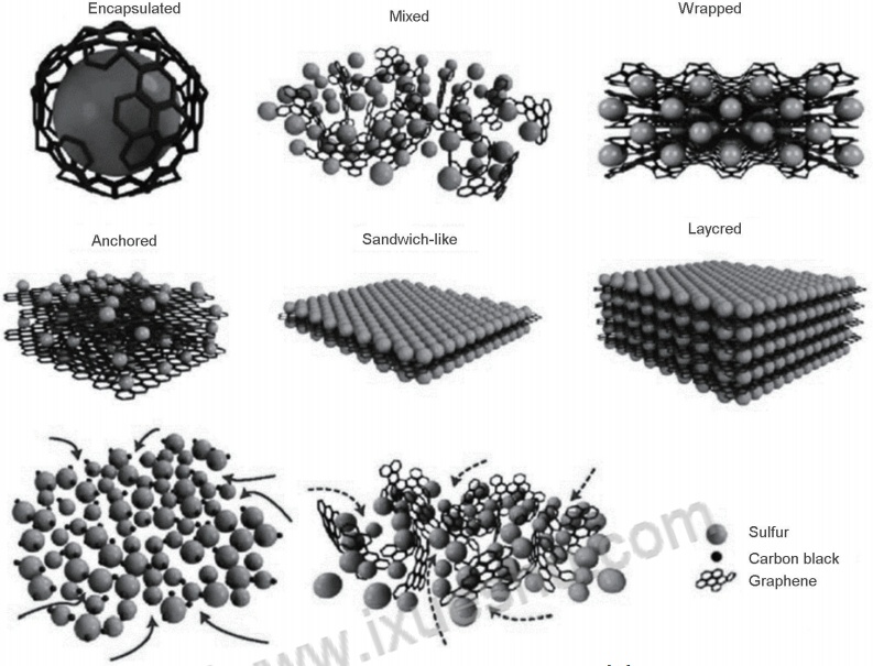 不難想象,石墨烯與硫結(jié)合形態(tài)眾多,如包覆、混雜、吸附、“三明治冶、插層堆砌等,如圖2所示。其實(shí),研究報(bào)道的各種微結(jié)構(gòu)和各種方法設(shè)計(jì)層出不窮。實(shí)踐證明,石墨烯與硫單質(zhì)多種結(jié)合形式的顯微結(jié)構(gòu)與相互作用,與石墨烯及其載硫復(fù)合材料的制備方法密切相關(guān),不同制備方法與工藝對(duì)鋰硫電池的性能影響較大。但是,受目前石墨烯的制備 方法和工藝的限制,常常以缺陷很多的Hummers法的(偽)石墨烯為基礎(chǔ),石墨烯基鋰硫電池的循環(huán)性能仍然不夠理想,還具有很大的提升空間。