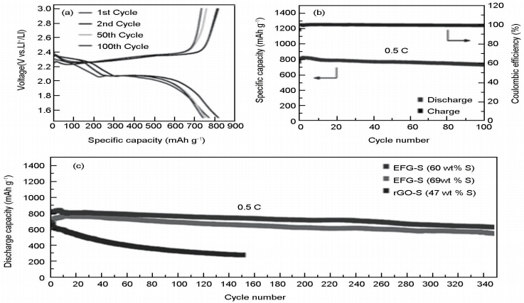 圖5 (a)氮摻雜石墨烯/硫的示意圖; (b)不同石墨烯-硫電極的電化學(xué)倍率性能;(c)0.5C倍率下的長(zhǎng)循環(huán)性能