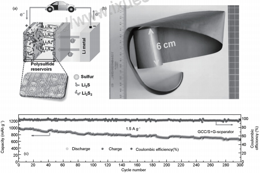 圖7 (a)石墨烯-硫-石墨烯結(jié)構(gòu)用于鋰硫電池;(b)柔性電極光學(xué)照片;(c)1.5A/g倍率下的長(zhǎng)循環(huán)性能測(cè)試曲線