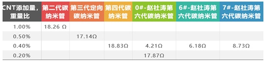 第六代碳納米管在鋰電池里與第二、三、四代碳納米管的極片電阻率對(duì)比測(cè)試數(shù)據(jù)