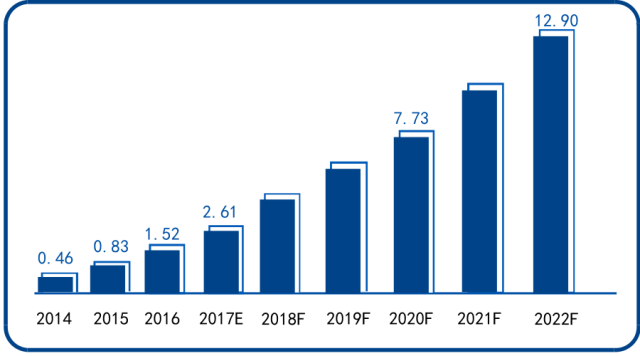 2014-2022年中國(guó)碳納米管導(dǎo)電漿料產(chǎn)值分析及預(yù)測(cè)(億元)