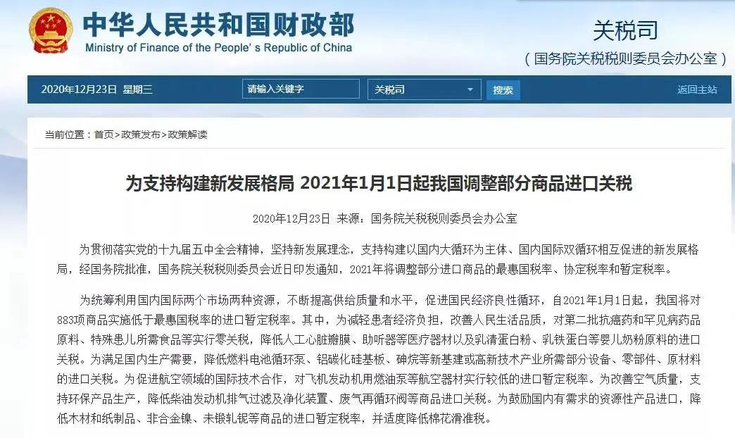 財政部發布通知明確,自2021年1月1日起,我國將對883項商品實施低于最惠國稅率的進口暫定稅率。其中包括,對第二批抗癌藥和罕見病藥品原料(43種)實行零關稅,還包括部分進口制劑產品,如多西他賽、紫杉醇、吉西他濱等傳統化療藥的原料,來那度胺、達沙替尼、尼拉帕利等知名品種,澤布替尼、阿美替尼、埃克替尼等國產抗癌藥。從關稅調整的幅度上看,所涉產品的2021年最惠國稅率一般在9%、6.5%、6%、4%、3%這幾個檔位,而調整后關稅均變為0。