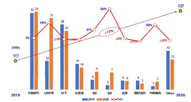 2020年寧德時代全年裝機量達34GWh,同比增長2%,漲幅較小。排名第二的LG化學全年裝機量僅比寧德時代少3GWh,達到31GWh,較2019年增長了19GWh,漲幅達150%。