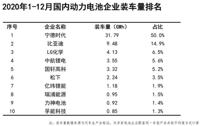 在國內市場,排名前十的企業分別是寧德時代、比亞迪、LG化學、中航鋰電、國軒高科、松下、億緯鋰能、瑞浦能源、力神電池、孚能科技。寧德時代全年裝機量達31.79GWh,占市場總裝機量的14.9%。