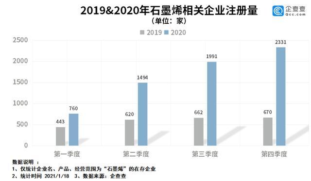 從季度注冊量來看,企查查數據顯示,2020年我國石墨烯相關企業注冊量按季度呈階梯增長趨勢,第一季度的注冊量最少,為760家,第四季度注冊量最多,為2331萬家。