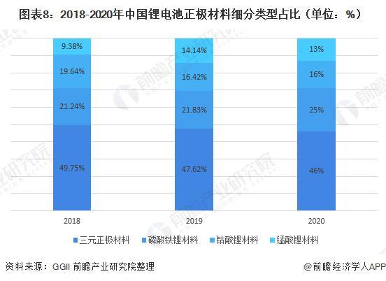 2020年中國正極材料出貨量51萬噸,同比增長27%。從正極材料產品出貨量結構來看,2018-2020年正極材料領域三元材料和鈷酸鋰材料占比略微下滑,2020年出貨量占比分別為46%和16%,磷酸鐵鋰占比由21.24%上升到25%。