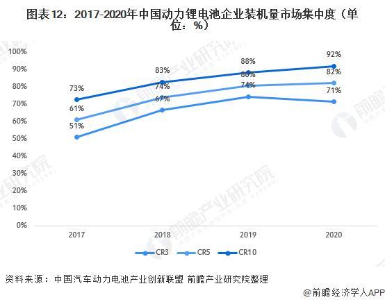 隨著動力電池市場競爭進一步加劇,龍頭企業優勢不斷放大,行業集中度持續提升。2020年,排名前3家、前5家、前10家動力電池企業動力電池裝車量分別為45.4GWh、52.3GWh和58.4GWh,占總裝車量比重分別為71%、82%和92%。